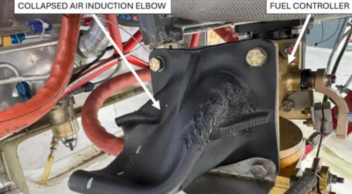 The part in question is a plastic air induction elbow — a curved duct that forms part of the engine’s air intake system. The collapsed part you see in the image above had an air filter attached to its front (towards the left in the image), which had detached and fallen off. Heat from the engine caused the part to soften and collapse, which in turn greatly reduced intake airflow, and therefore available power